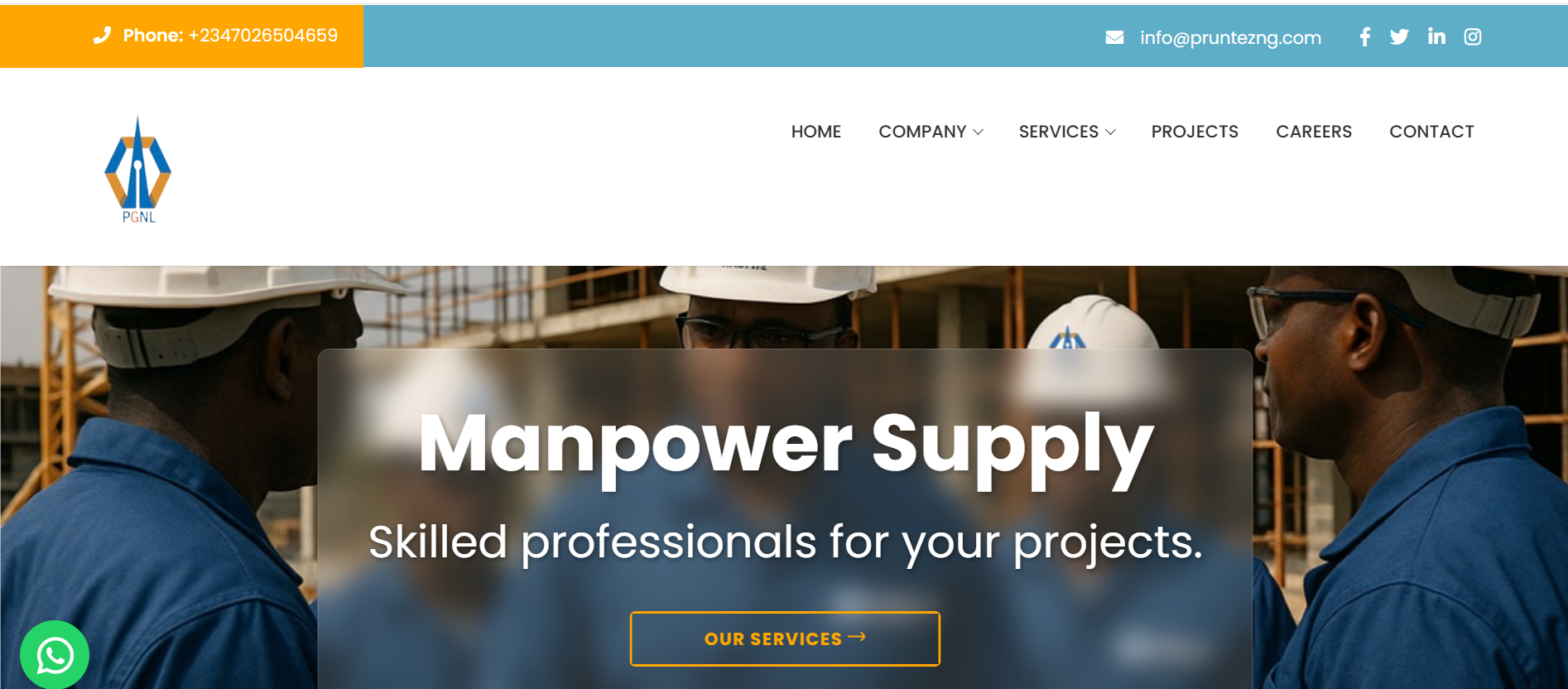 Pruntez Website Pruntez Global Nigeria’s website presents its energy, environmental, and infrastructure services with clarity showcasing expertise while ensuring easy navigation and a modern, client-focused experience.