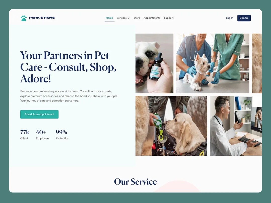 Pet Care Consult ParkPaws delivers a clean, user-friendly website that promotes its dog-walking services through simple navigation and engaging visuals. The site makes it easy for pet-owners to understand services, book walks, and ensure their dogs stay happy and active.
